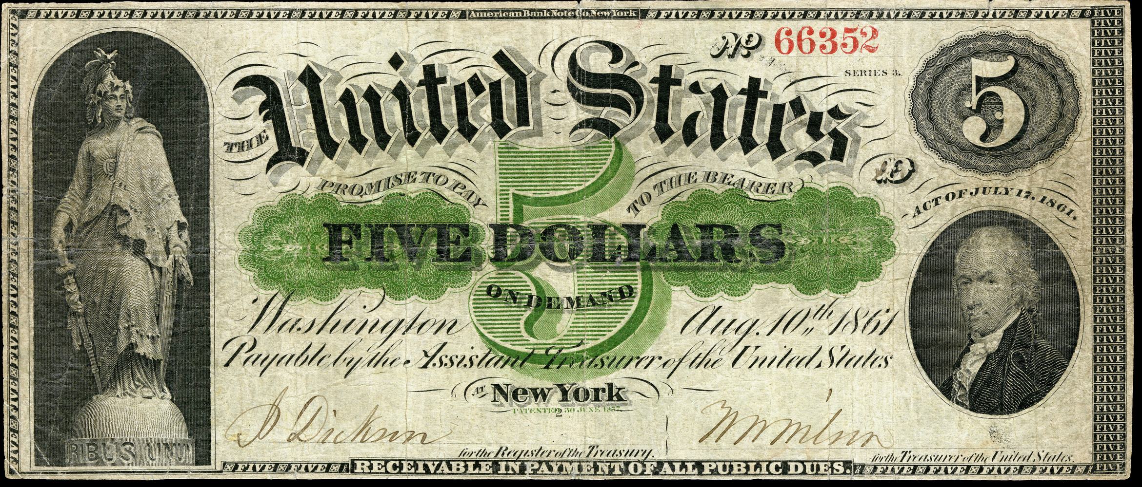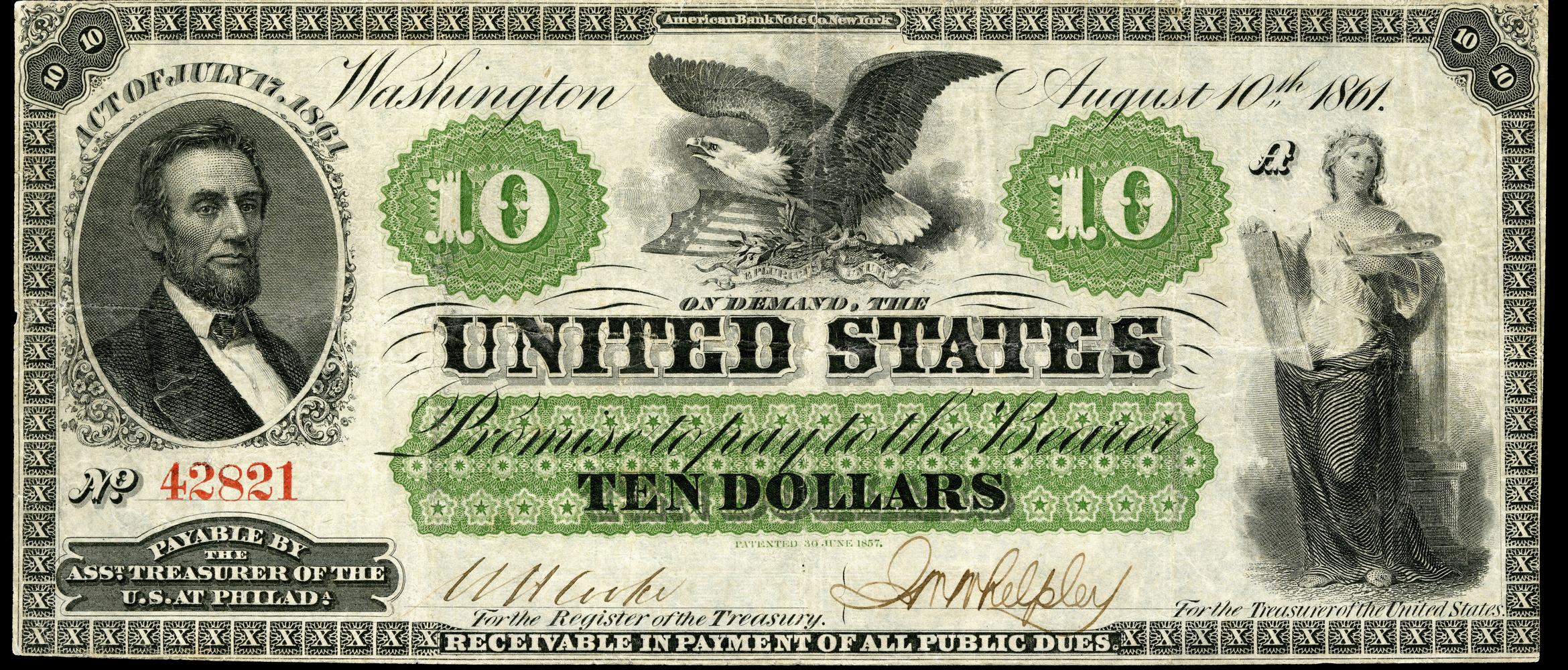 On the brink of bankruptcy and pressed to finance the Civil War, Congress authorized the United States Treasury to issue paper money for the first time in the form of non-interest bearing Treasury Notes called Demand Notes.