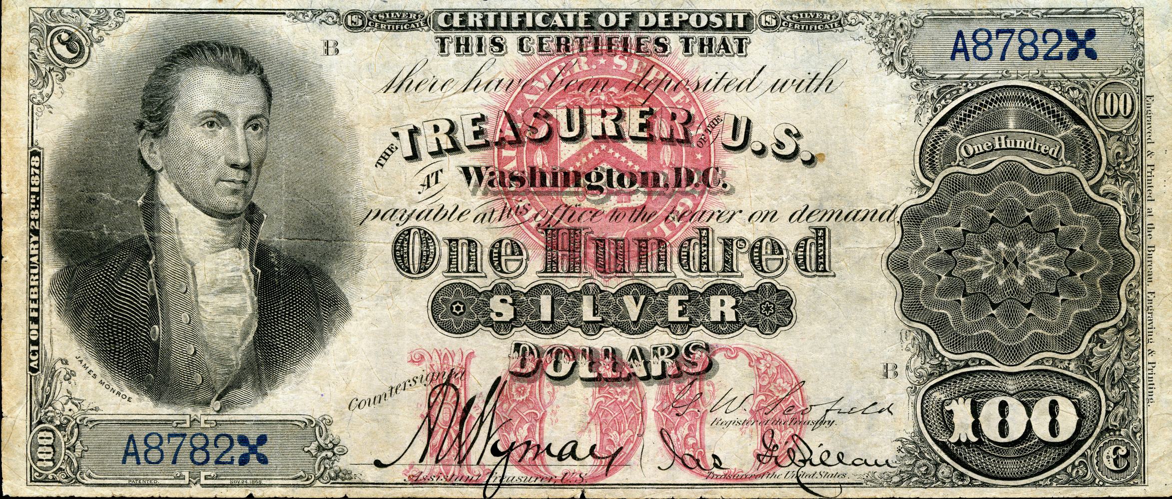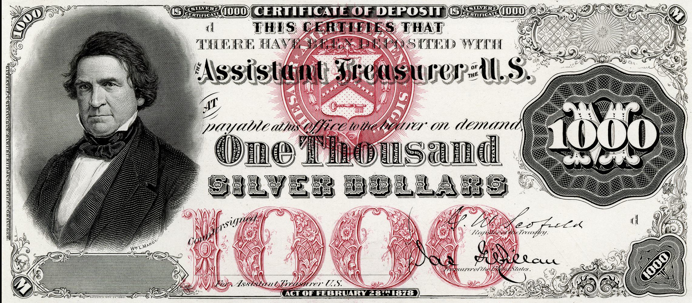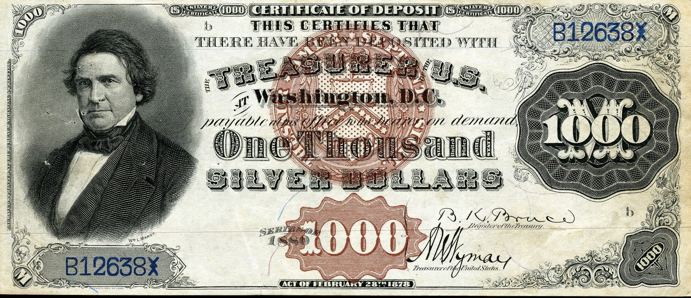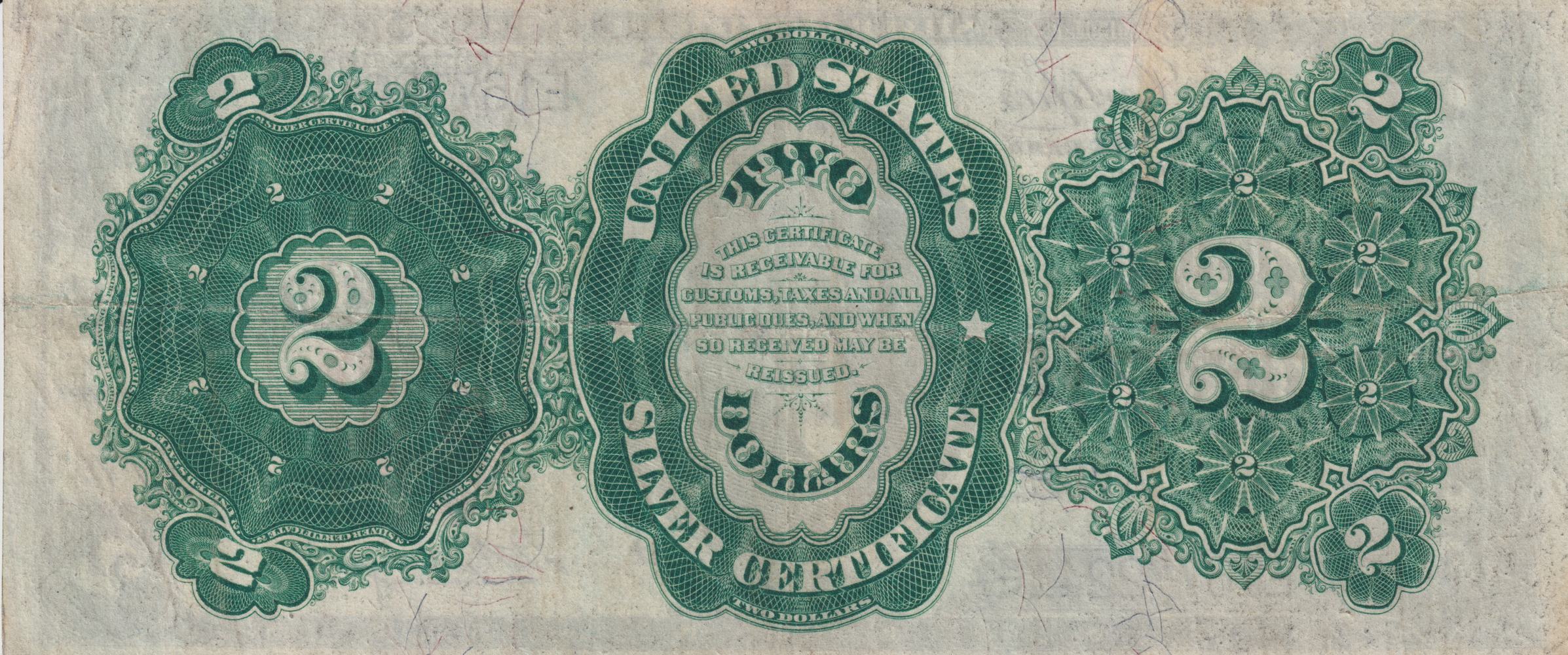 The original plan was to eventually have this type of artistic and educational design used on all denominations of silver certificates from the one dollar to the one thousand dollar note. The $1, $2 and $5 denominations were printed and released.The plates for a $10 note were engraved but notes were never issued as the Act of Congress of August 4, 1886 did not authorized them.