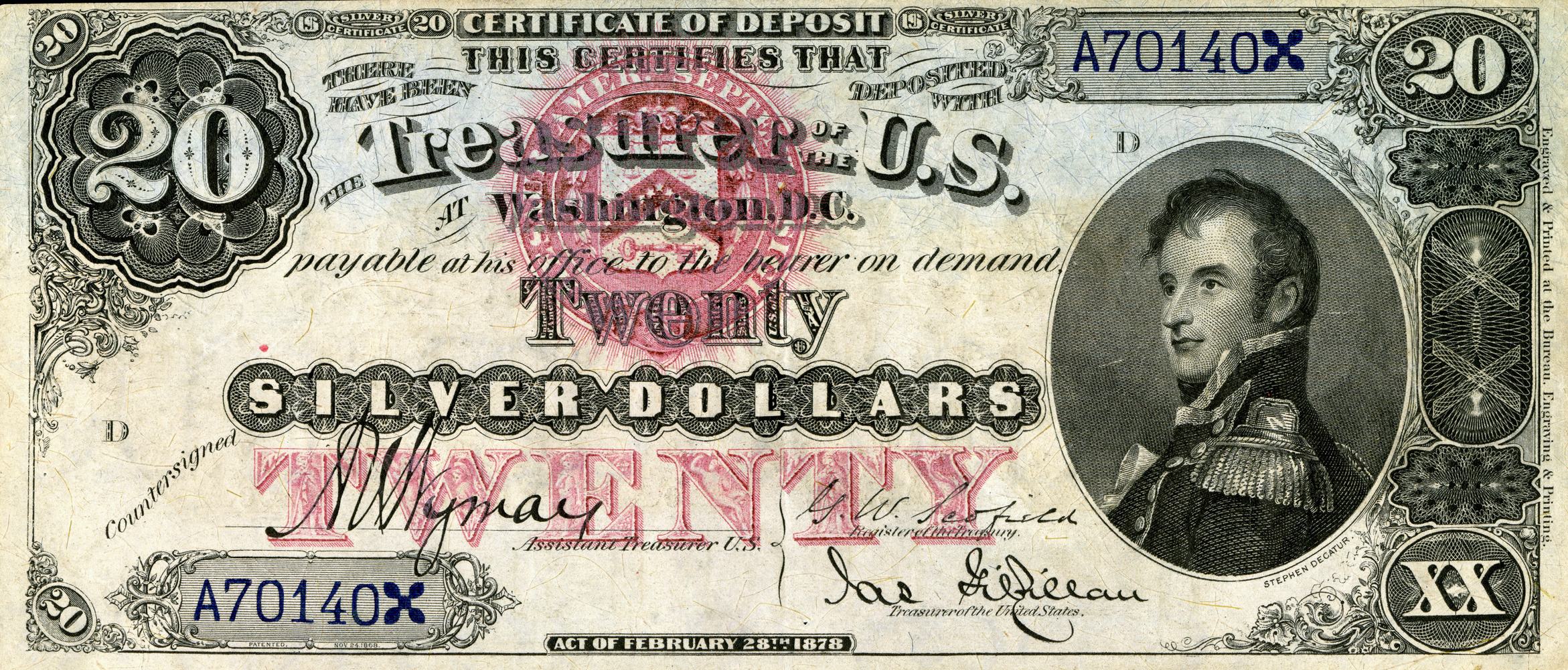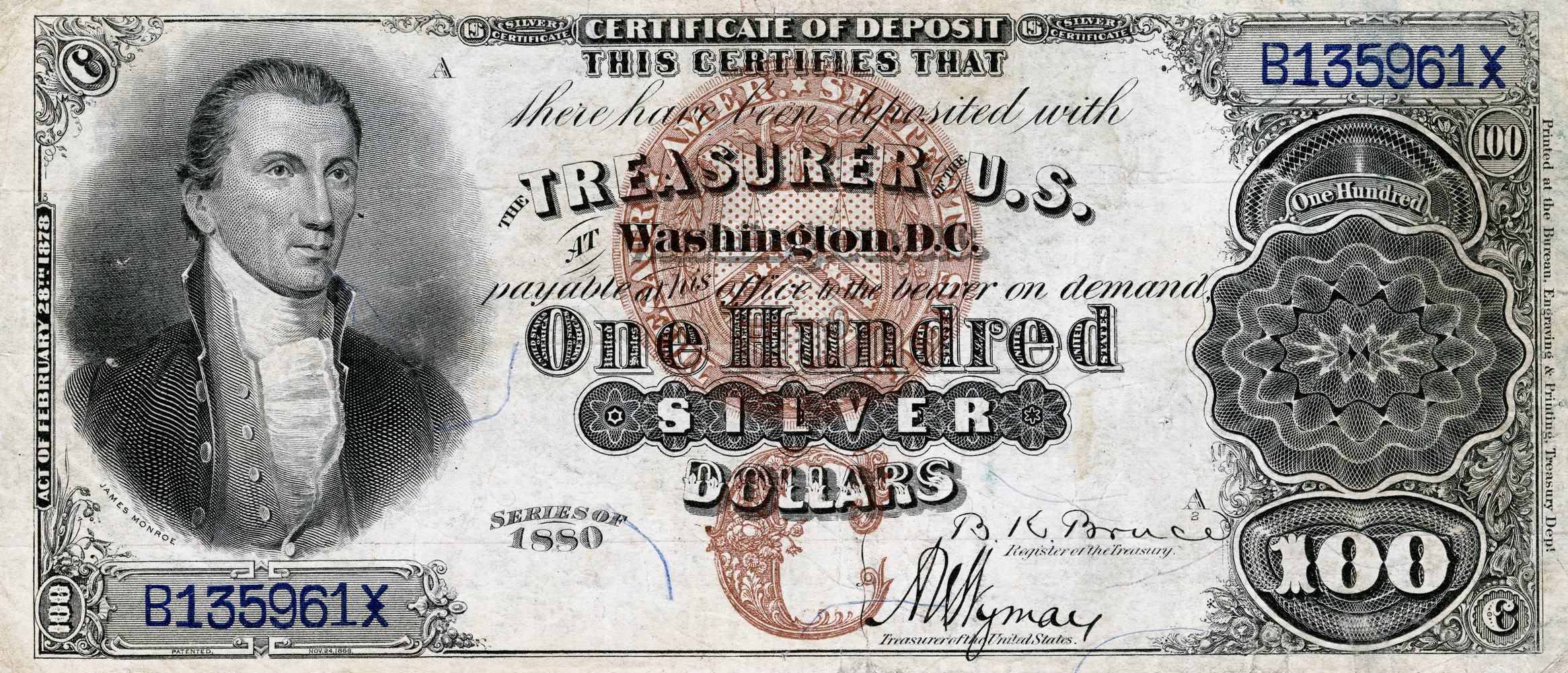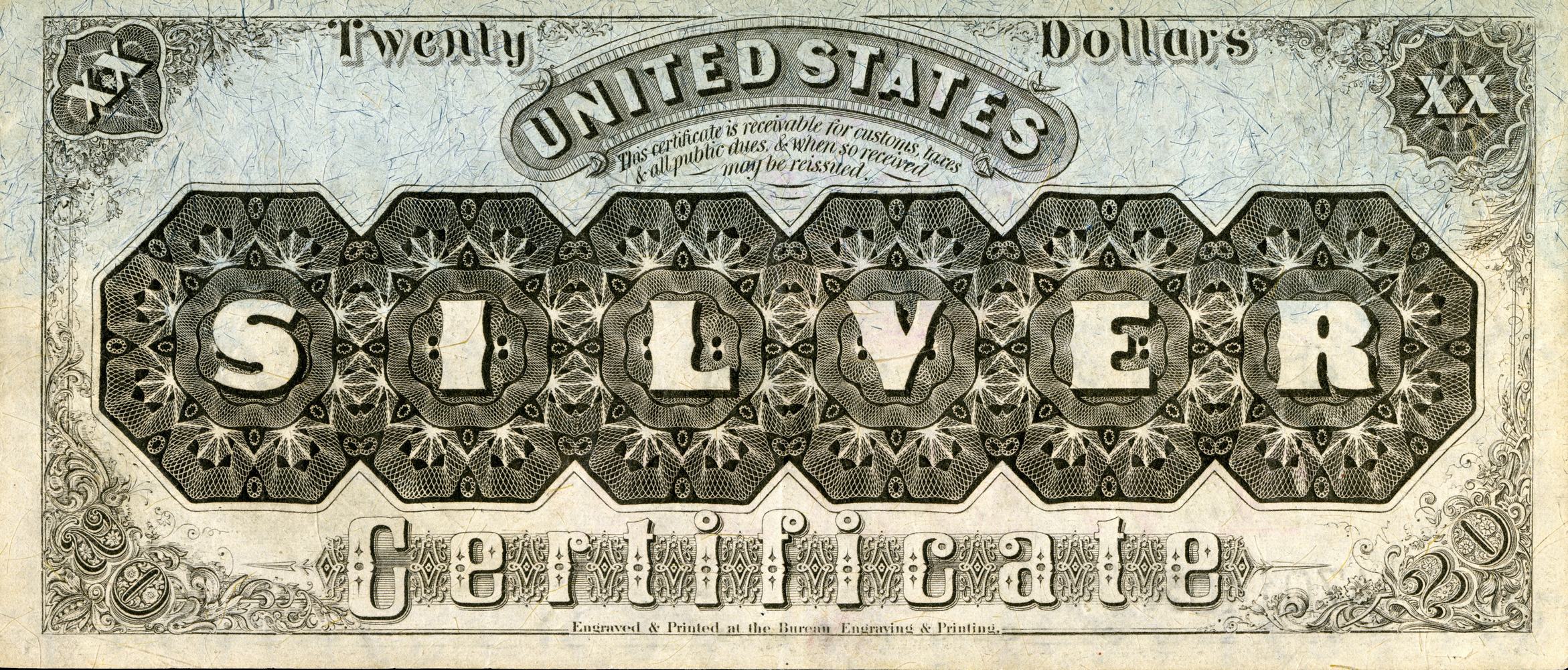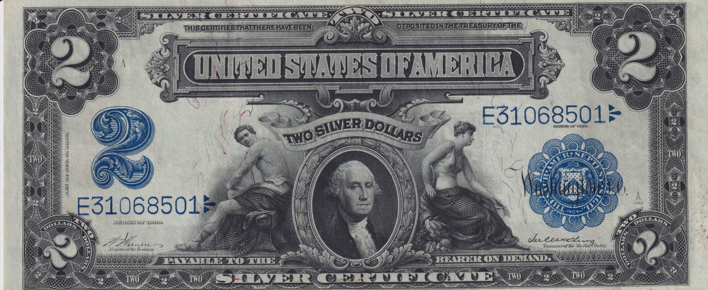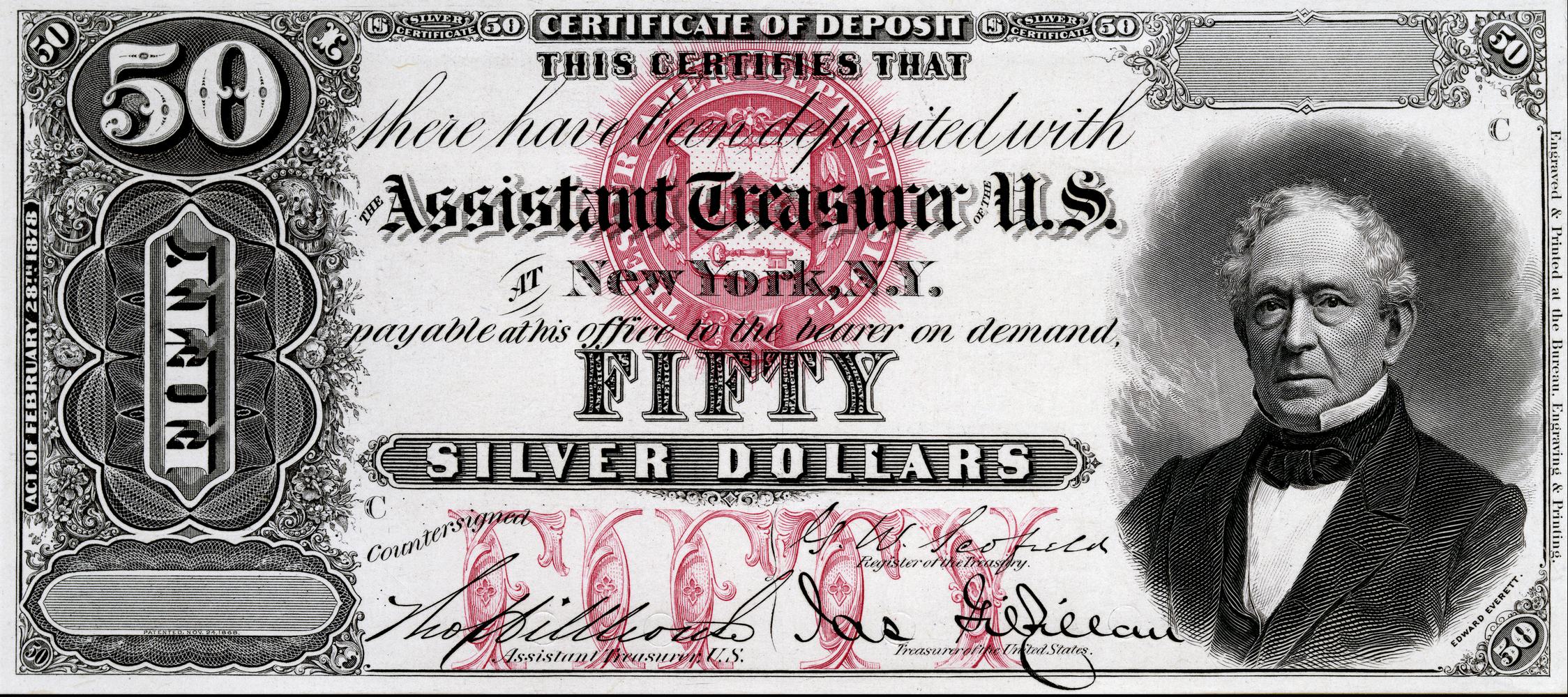 The original plan was to eventually have this type of artistic and educational design used on all denominations of silver certificates from the one dollar to the one thousand dollar note. The $1, $2 and $5 denominations were printed and released.The plates for a $10 note were engraved but notes were never issued as the Act of Congress of August 4, 1886 did not authorized them.