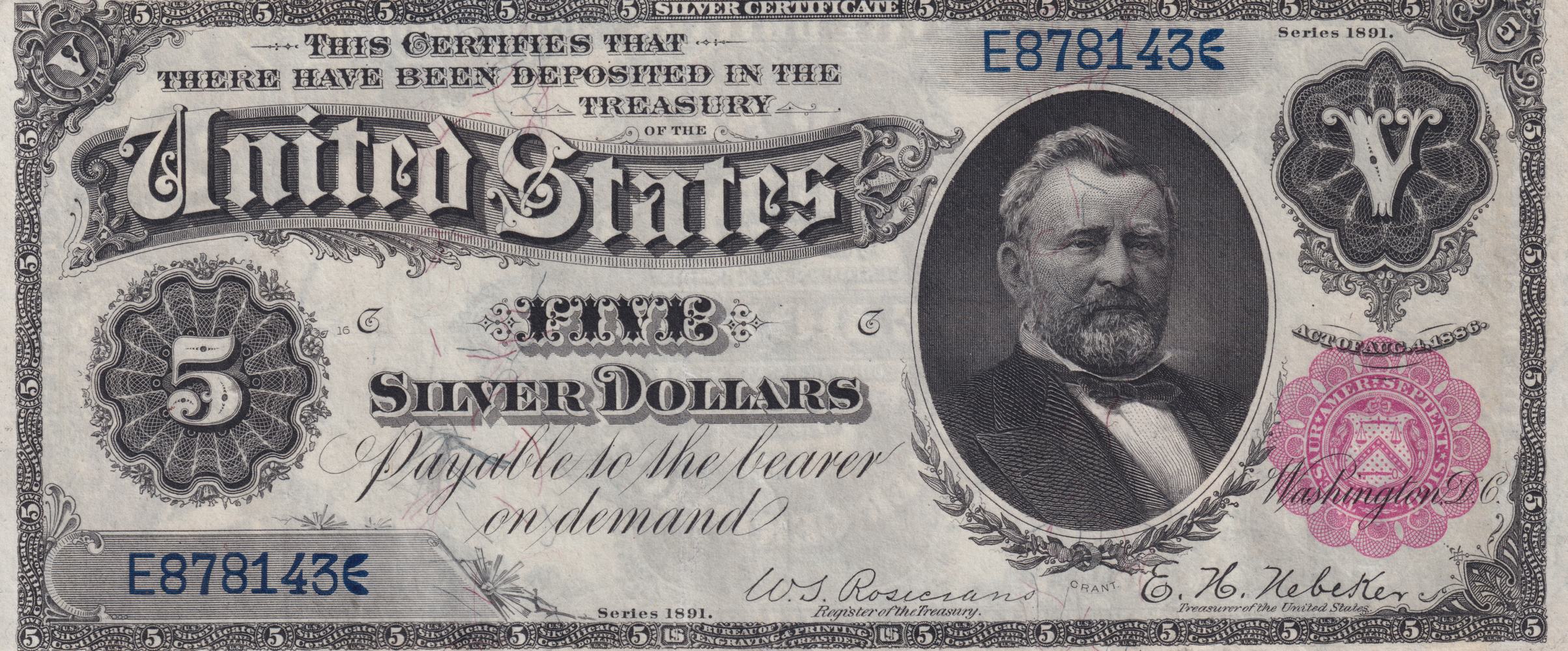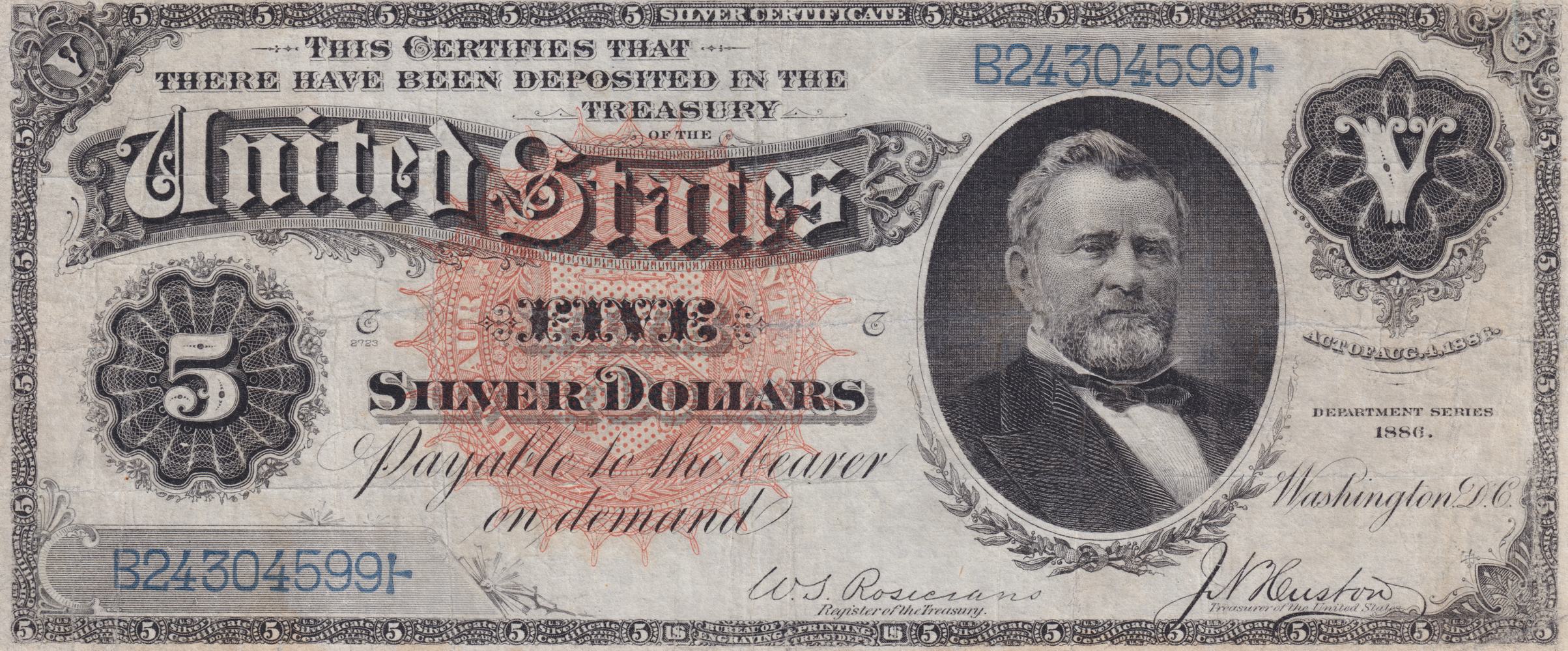 A portrait of Ulysses S. Grant appears on the face. The 1886 note has a unique back design featuring five Morgan silver dollars in a highly detailed engraving.