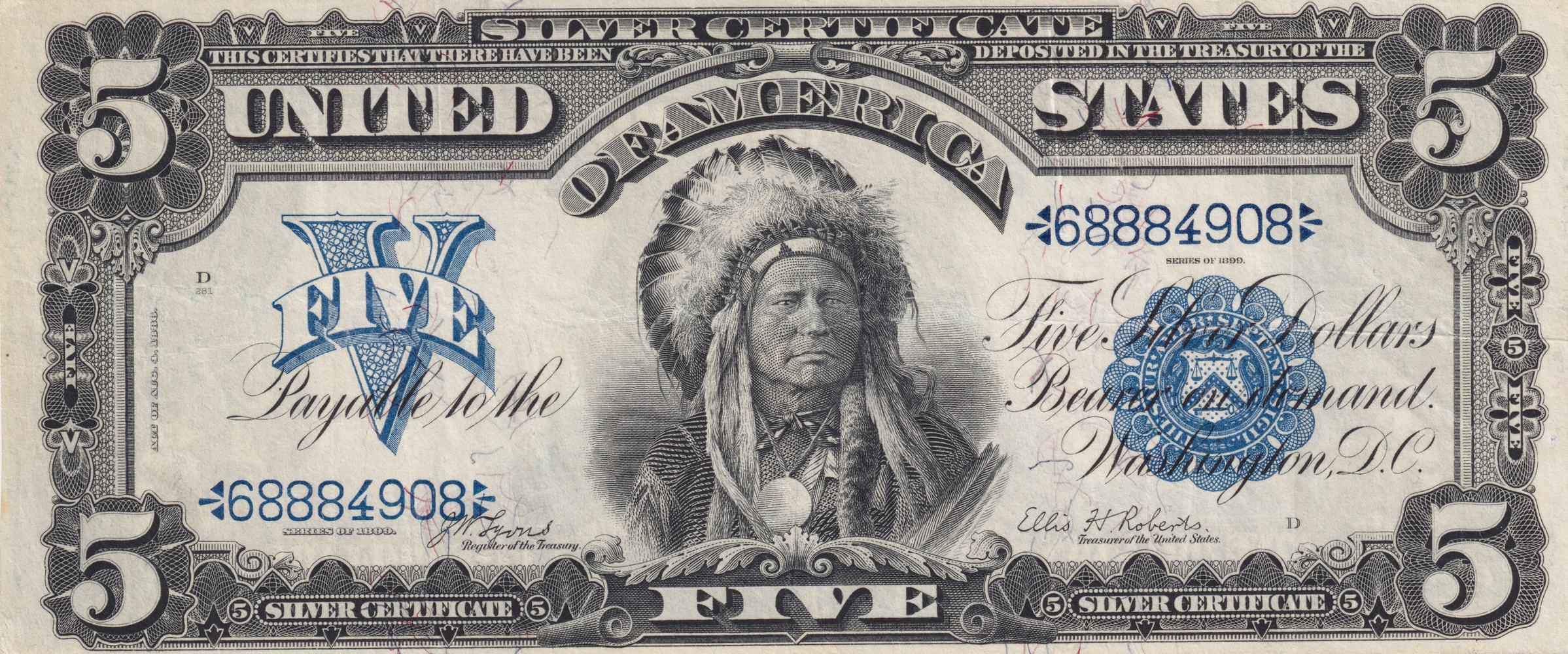 In this photograph he was ONLY wearing three feathers in his hair, fur braid wraps, and dentalium earrings, and holding a wing fan and a piece pipe.Very interesting, look at the note and you will see he's wearing a medal, the very medal (featuring President Johnson) that he received for signing the 1868 Treaty.While the portrait is labeled Onepapa, it is incorrect, his tribe was ONCPAPA pronounced Hunkpapa.Chief died in 1896 and never saw the printed notes since the engraving was not completed until Jan. 7, 1900. Production of the notes ran from 1900 to 1926.