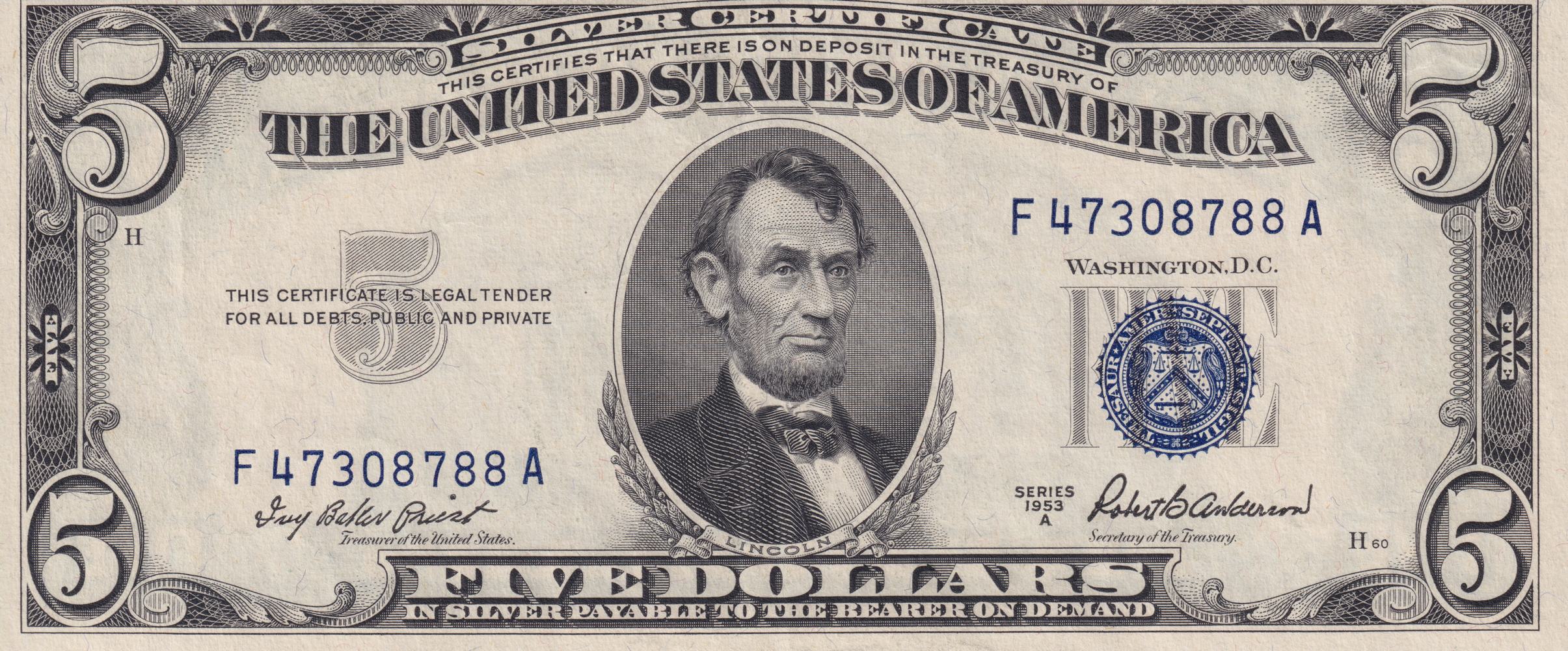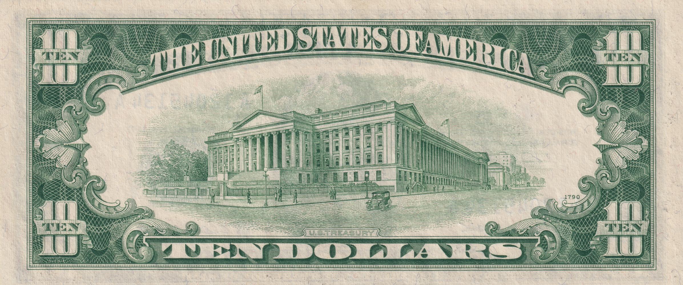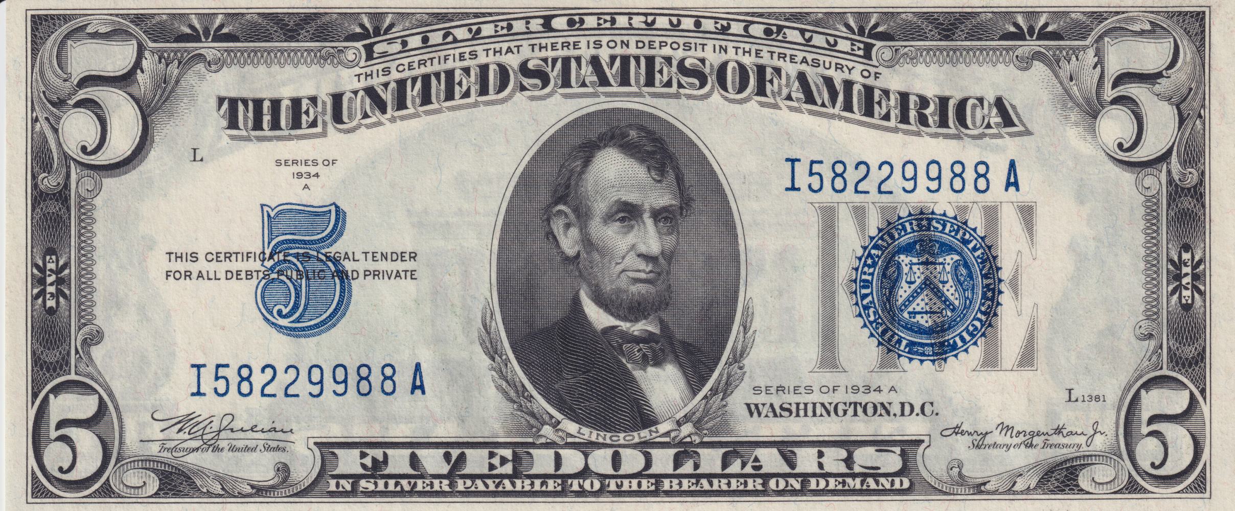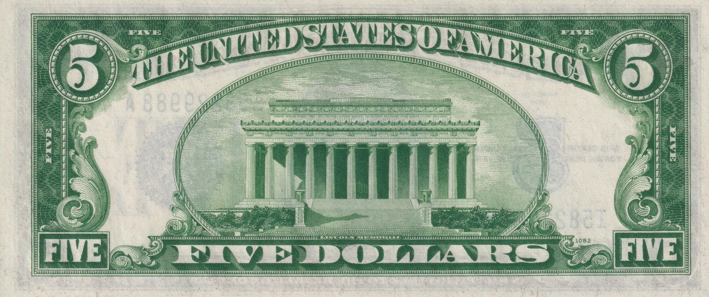 The vignette on this note is titled Eagle of the Capitol, but it is nicknamed "Black Eagle." Portraits of Lincoln and Grant are beneath the denomination on the face. An engraved design with an obligation is on the back.